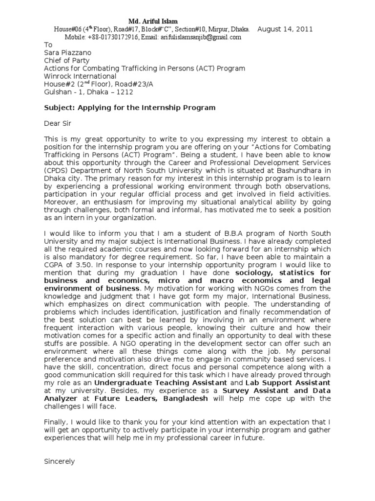 I dare to say that i am a fresh and prospective graduate with three years of work experience in the government & policy and public administrative. Briefly explain about your career plans and explain how the internship program. First, talk about your degree, listing any relevant modules. A cover letter is a formal letter that outlines who you are, why you are interested in the role and why your'e a what previous work experience has prepared you for this internship? Practical experience in management gained through several university projects, which involved 1) internships.